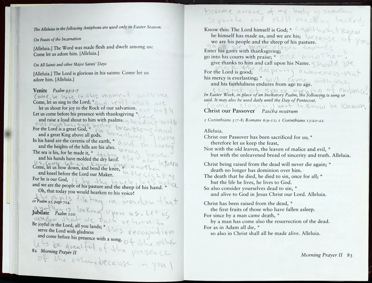 For one week I skipped the highly recommended morning prayer at my seminary. Instead, I responded to pieces of the morning prayer liturgy, inscribing associated experiences in copies of the Book of Common Prayer. These books were placed back into circulation in the chapel where they remain. The front page is signed, the only indication of the source of the soliloquy contained within.